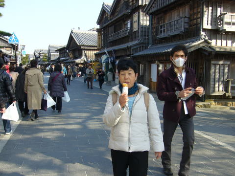 おかげ横丁で他のメンバーと再度合流。まだ朝飯前だったので、朝食代わりにいろいろスナックをいただく。タコ天、コロッケ、「伊勢うどん」など。伊勢うどんは讃岐うどんとはまったく別物。汁なしなところは生醤油うどんと似ているが、味は甘くてうどんは非常に柔らかくてコシが無い。二人でひとついただいたが、あっと言う間にペロリ。消化は良さそう。これで昨日処方してもらった薬が飲めるようになった。