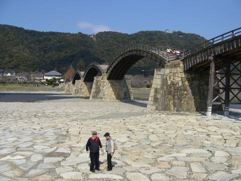 錦帯橋には10時40分に到着。ありがたいことにここは駐車場が広くしかも無料。昨日の宮島とは大違い。橋を河原から見るだけなら拝観料?も無し。ただし、橋を渡る際に維持協力金として¥300が必要になる。橋の維持に協力する意図を示すことにし、橋を渡ってみた。アーチが5つ連続した形だが、真ん中の2つのアーチが太鼓になっていて、橋桁の足組が異なる。歩く場合はこの部分のみ段差があまり無い階段状になっている。この段差が低すぎて結構歩きにくい。記念撮影をしつつ、対岸まで渡る。