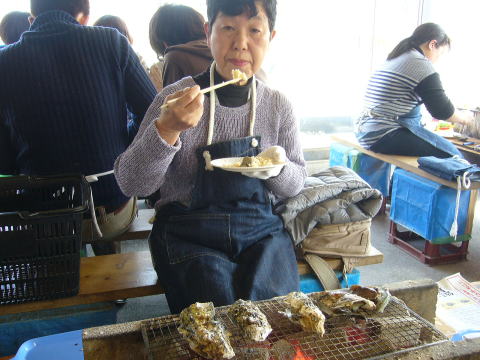 牡蠣は焼いているうちに爆発することがあって、あちこちでパカーン!と派手な花火が打ち上がっていた。熱い牡蠣殻が飛び散るのでエプロンは必須。平日なので、オープンしている小屋は1つだけだが、それでも場内は満員の盛況。お客は観光客と地元の人が半分づつといった具合。結構皆さん沢山召し上がっていて当家はすくない位。