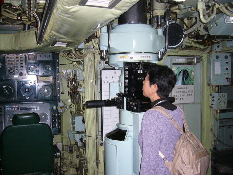 艦内は想像以上に狭い。映画「レッド・オクトーバーを追え」で見た様子とは大違い。もっともレッド・オクトーバーは原潜だし、大きさも違うから仕方ないのだが。士官のベッドでも3段ベッド。ベッドのサイズは我がキャンピングカーのベッドとほぼ同じ。寝た場合の上部空間は当家の下段ベッドの方がちょっと高いようだが、ほぼ同じようなもの。居住性が良いとはとても言えない。艦内至る所に計器、パネル、配管がむき出しで、歩くのも大変。これで何日も過ごすのはさぞかしストレスが溜まることだろう。記念に潜望鏡を覗かせてもらったが、このお値段がなんとなんと6億円もするとのこと。軍備は金がかかるということ。