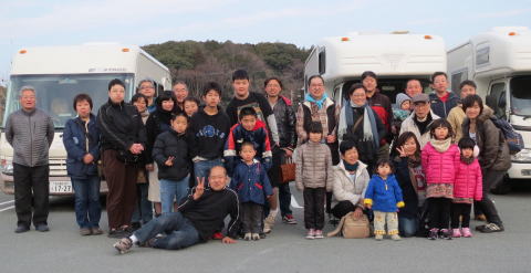 どたばたしたが、ようやくお買い物を終えて集合場所、ロッジ「カンパーニャ志摩」へ。到着したらすでに大半の仲間が到着済みで、自分たちは最後の方のグループだった。狭い駐車場内に11台のキャンカーを泊めるので、大変。なんとか納めて仲間と合流。すでにコテージでは宴会が始まっていた、当家からは「ちまき」とキウイフルーツを提供し、持ち寄りのご馳走によるの大宴会に合流。大人と子供で大変賑やか。この会にはあまり参加していない私達は半年どころか1年ぶりの再会をした方が大半。それでもしーとさんは有名人らしく、直ぐに仲間入り。