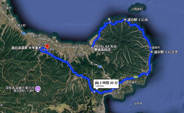食事を終えてもまだ雨は降っている。これからどうするか協議した結果、今日の観光はやめ。明日は曇りの予報なので、あらためて国東半島制覇にチャレンジすることにした。前線基地は最寄りの道の駅「なかつ」と決めて、中津を目指す。