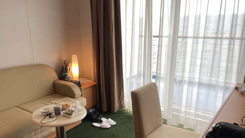 まずは朝食。このホテルはバイキング形式の朝食が付いている。和洋折衷だが一通りの食材は用意されていた。まだ歩くのがしんどいので、私の分はパンを主食として選んでもらった。フリードリンクもあり、まずはモーニングコーヒーを頂くことに。ほぼアメリカンのような薄いコーヒーだが胃に優しそうでグッド!(実は逆流性食道炎で医者からコーヒーを控えるよう指示されている)