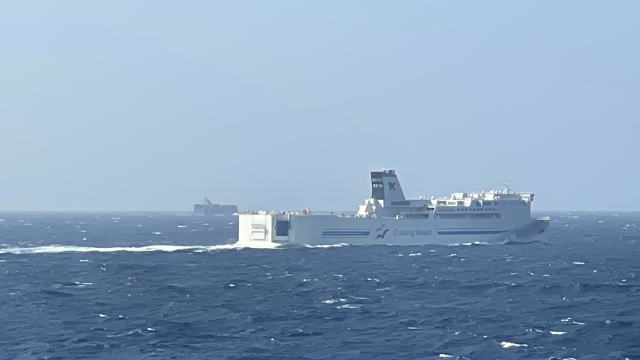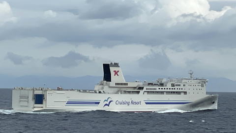 誠子マミーがお風呂から戻ってくる頃には船内食堂の朝飯タイムは終了。元々朝は食欲もないのでしょう、持参したロールパンとカフェオレ、紅茶オレで簡単に朝食。その後は今まで書き溜めた11日分の日記の整理。それから使った経費の精算などで忙しい。合間に10過ぎには横須賀から門司に向かう姉妹船「はまゆう」とすれ違うところを撮影。