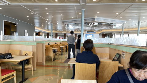 そうこうしているうちにランチタイム。食欲のない私には船のランチは重すぎるので、誠子マミーだけ食堂に行ってもらう。海鮮系の丼を食べたそうだが、いかんせん今回旅行中はとびきり美味いものを食べ続けてきたので、どうにも評価が厳しい。私は船内探索中に、見つけたカップ麺コーナーで「どん兵衛」で簡単に。