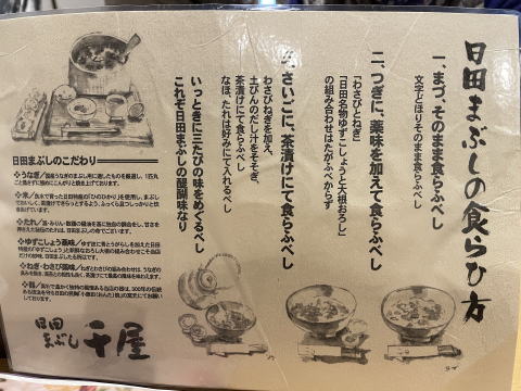 下駄屋さんで時間を食ったので鰻屋さん(千屋)到着は12時を回ってしまった。店内に入ったら、すでに待ち人が数名。こりゃタイミングを間違えたかと思ったが、意外にすぐに順番が来た。店の間口からすると予想以上にキャパがあった。メニューは「日田まぶし」の普通盛りと大盛りの2種類のみ。当家は迷わず普通盛りを。お値段\3800なり。