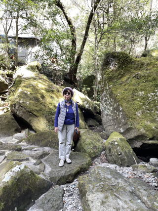 ランチの後、案内所で教えてもらった渓谷の対岸を回って帰るつもりで、麗谷渓谷路に向かった。岩だらけの渓谷を横切って対岸へ。ここから急な山道になり、2人ともふうふう言いながら登る。かなり登って平坦道に出たので、念のため方向が正しいかgoogle