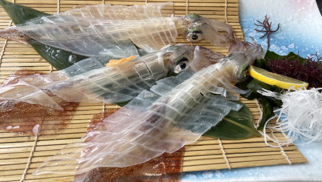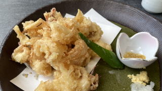 注文したのはイカ三昧。定番のイカシュウマイ、イカ刺し、ゲソの天ぷらに茶碗蒸しと小鉢、デザートが付く。最初に出てきたシューマイはフワフワで風味あり。続いて供されたイカは二人に対し、小ぶりのものが三匹付いて来た。身は薄いがコリコリして弾力がある。勿論身はすき通っていて裏が透けて見える。当然二匹は誠子マミーに提供。私が1番美味いと思ったのはイカ刺しの余った部分を天ぷらにしたもの。これを天つゆと粉末の柚子胡椒でいただく。揚げたてであることにもよるが、本当に文句なしにうまかった。