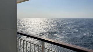 午前8時に起床。起きたら肩やら首が痛い。やっぱりまくらが合わないと寝た気がしない。しばらくしてから誠子マミーは大浴場へ。入れ替わりで今度は私が風呂へ。フェリーの風呂は銭湯のような作りで、湯船は2つ。それに何と露天風呂までついている。先客は2名。ゆったりと浸かる。思い立って露天にも入ってみた。半露天で半分は吹き曝し。進行方向に向かって浸かると顔に風が当たってあまり長居できず。向きを変えて風向きに背を向けて浸かると、これはもう極楽ごくらく。気のせいか首と肩の痛みがすこし取れたような気がする。