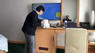 午後3時過ぎになって晴れてきた。船は四国と九州の間の豊後水道に入りかけたところ。時刻は午後4時。門司到着まであと5時間。誠子マミーは折り紙を折っている。折り紙の資格を取るため通信教育を受けているところ。課題の作品数が100あるようで大変そう。